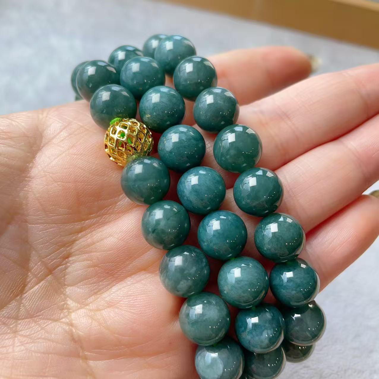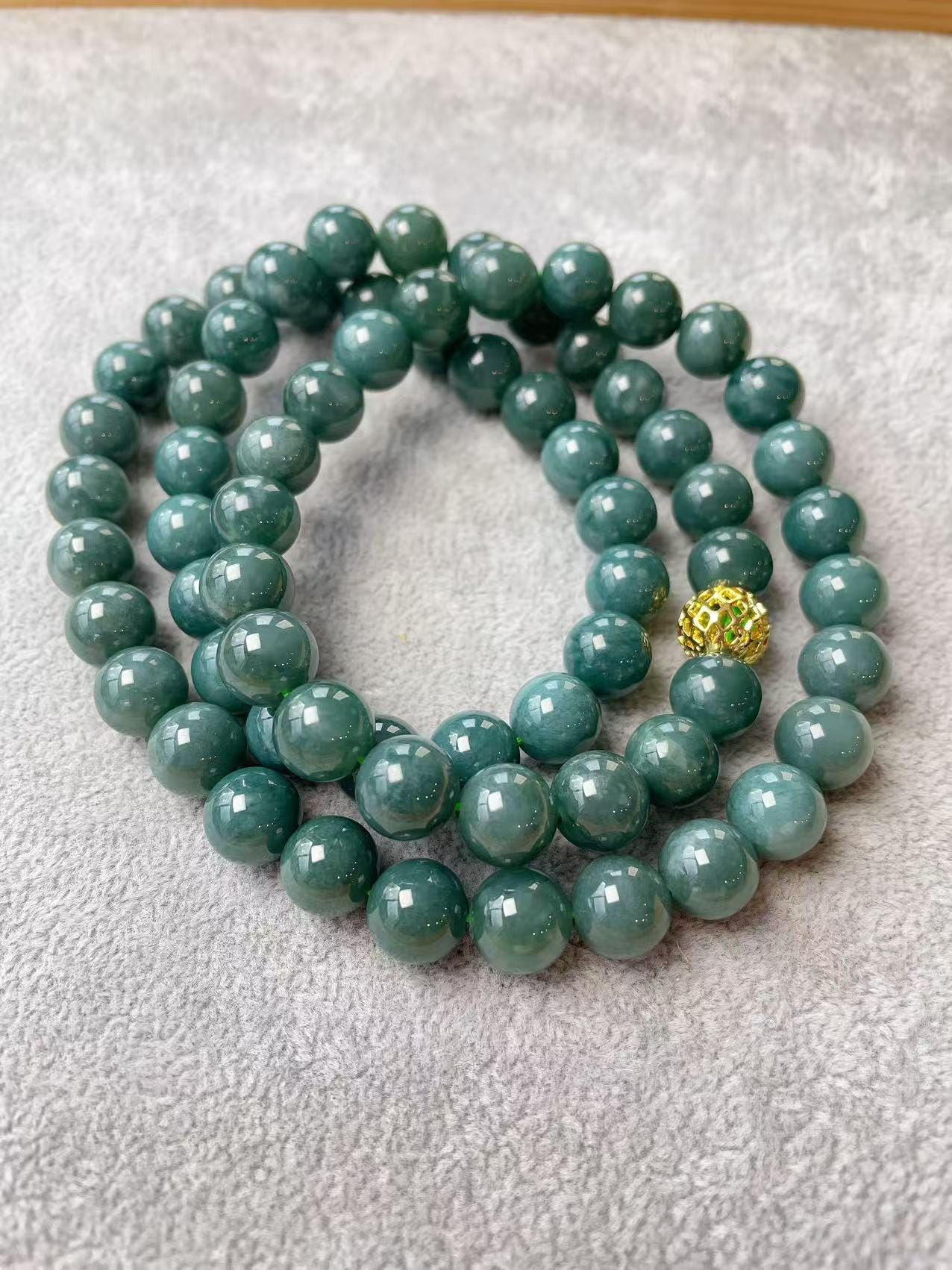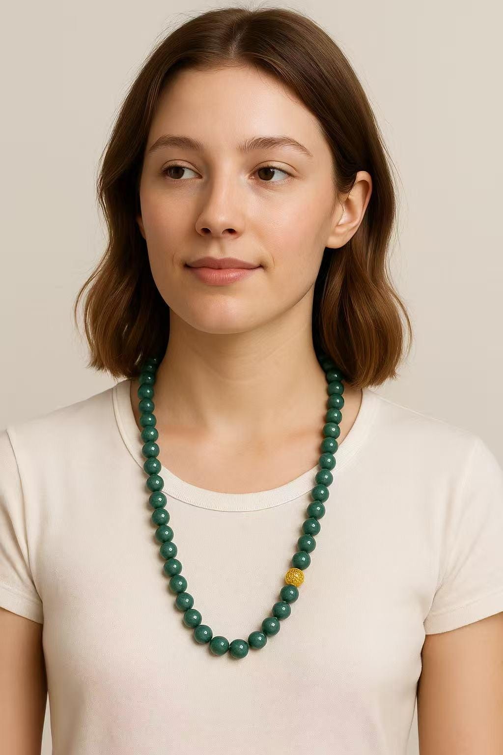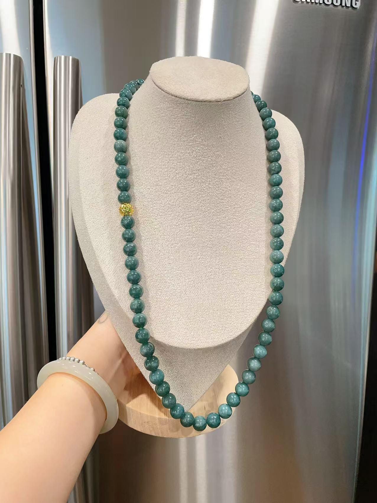 This elegant long strand is made of natural blue jade beads, each about 10mm in diameter. The refreshing blue-green tone is subtle yet timeless.