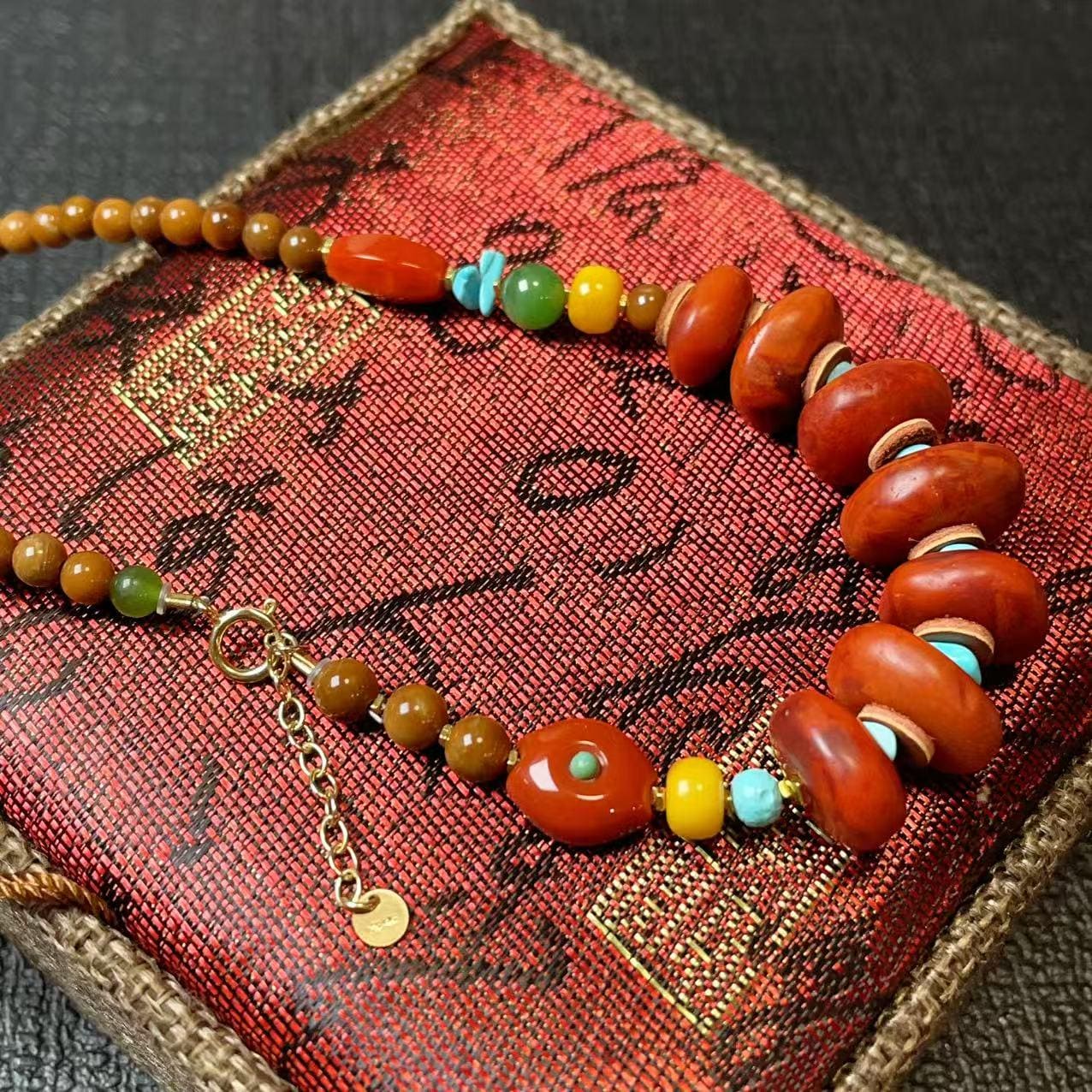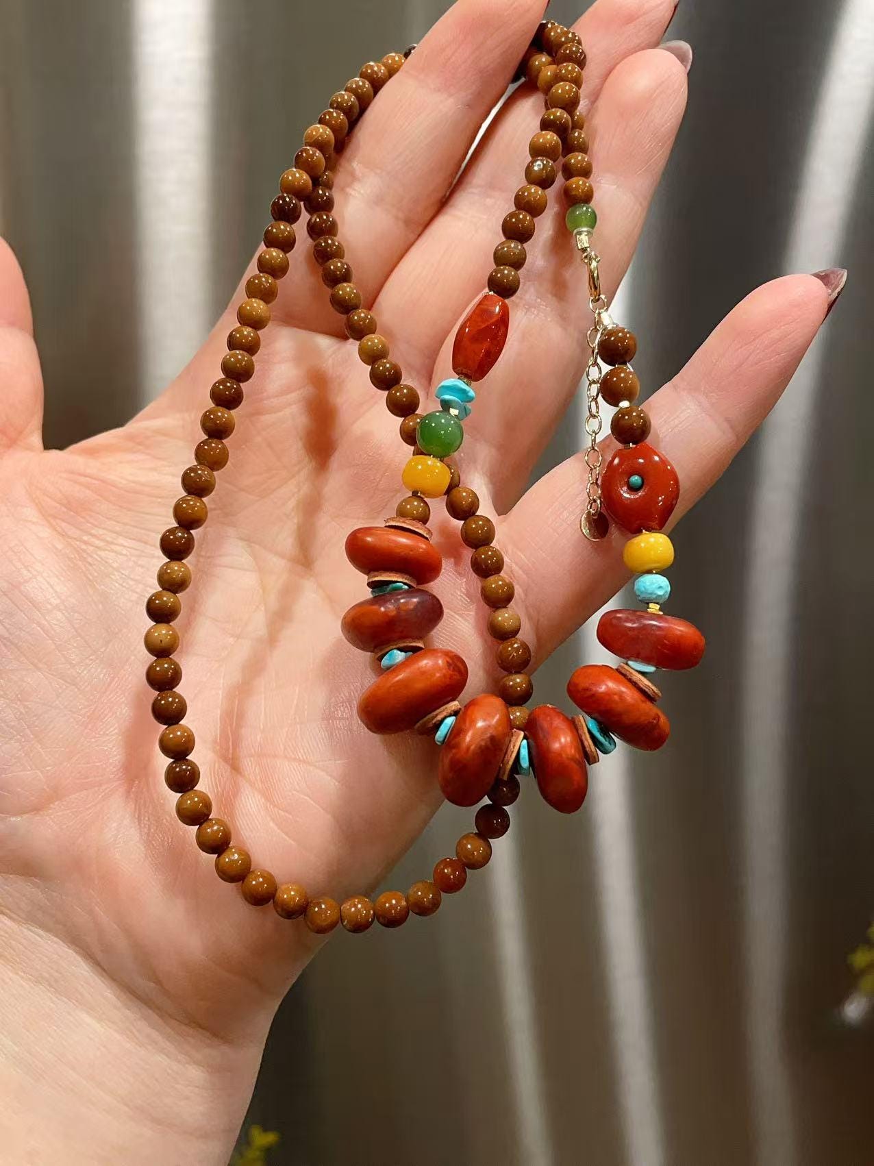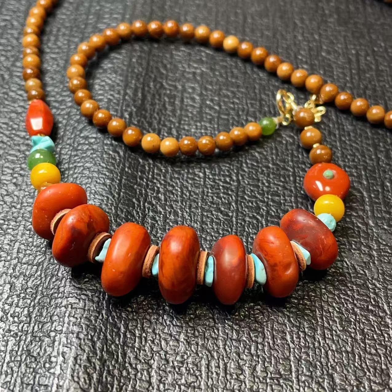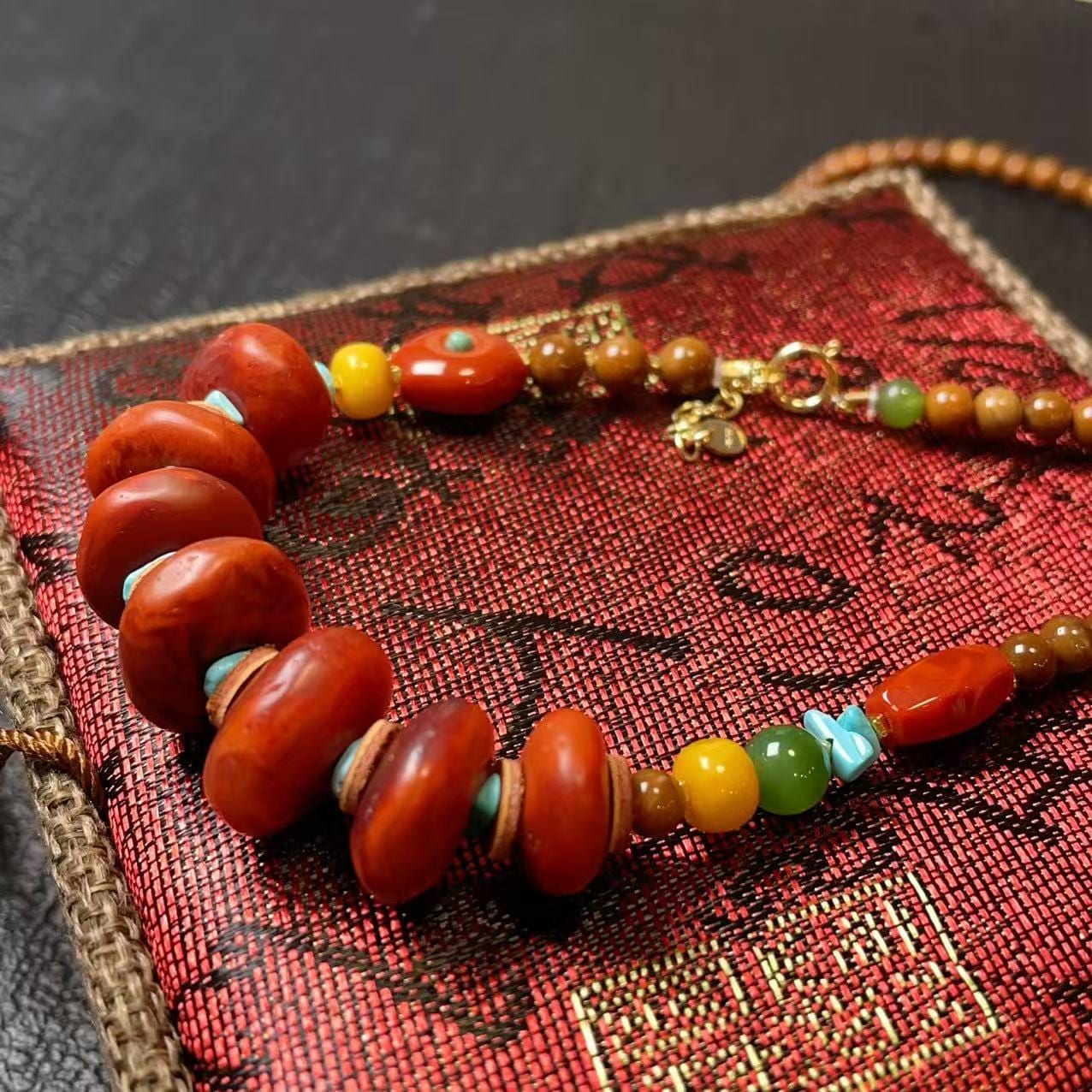 A beautifully handcrafted gemstone necklace featuring rich natural colors and a grounded, earthy elegance. This piece blends deep red agate, turquoise nuggets, yellow honey beads, and polished brown wood beads, creating a warm and vibrant palette inspired by traditional ethnic jewelry.