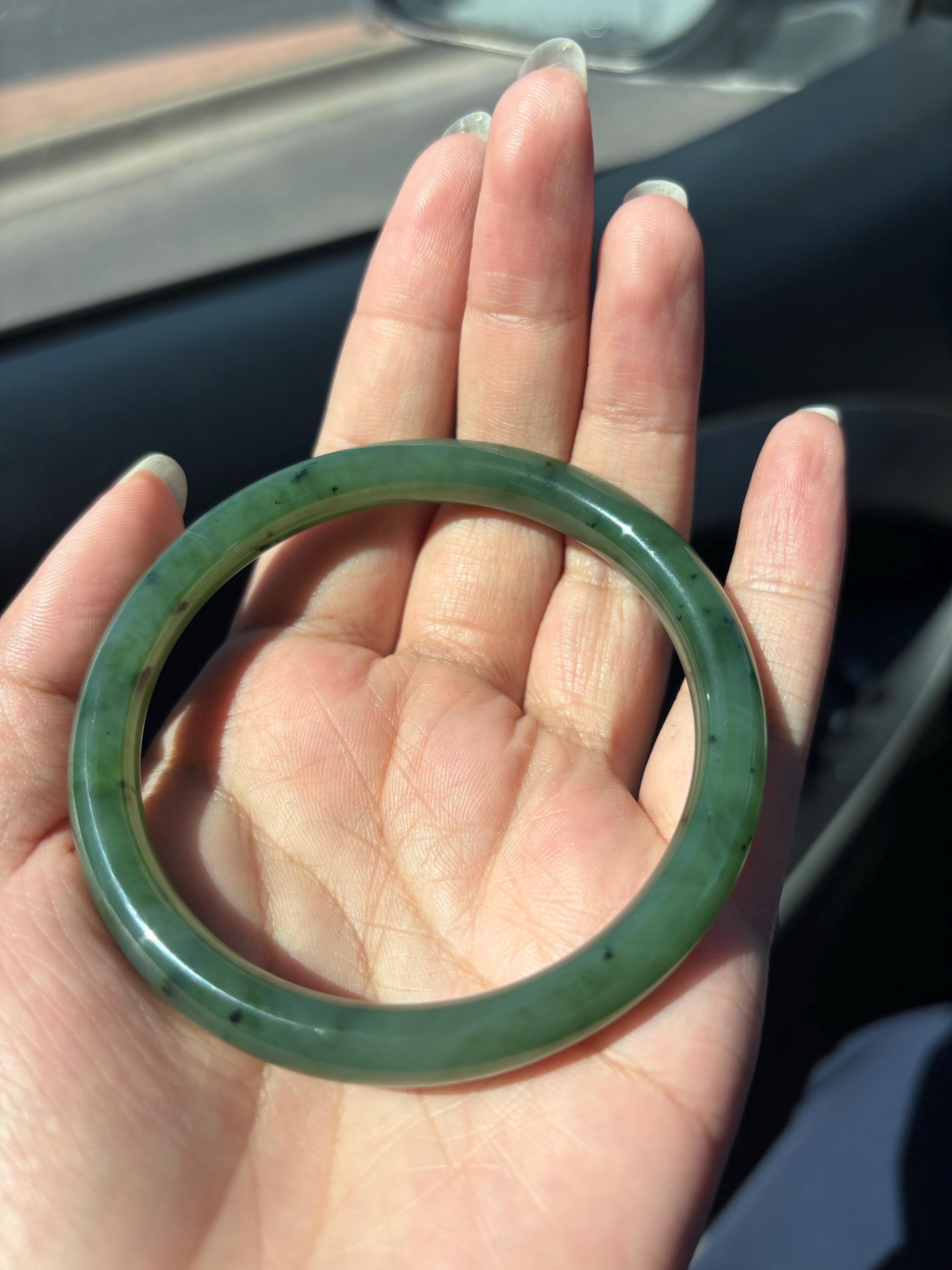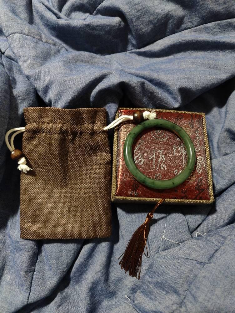 The nephrite jade bangle is exactly what I was hoping for. I love the green color and the little black inclusions in the stone. The drawstring pouch and the gift box the bangle came in are really pretty! The shipping speed was not too bad.