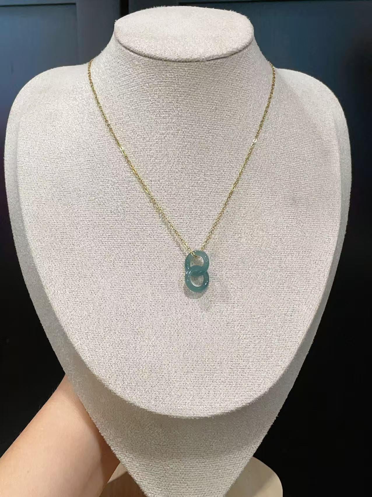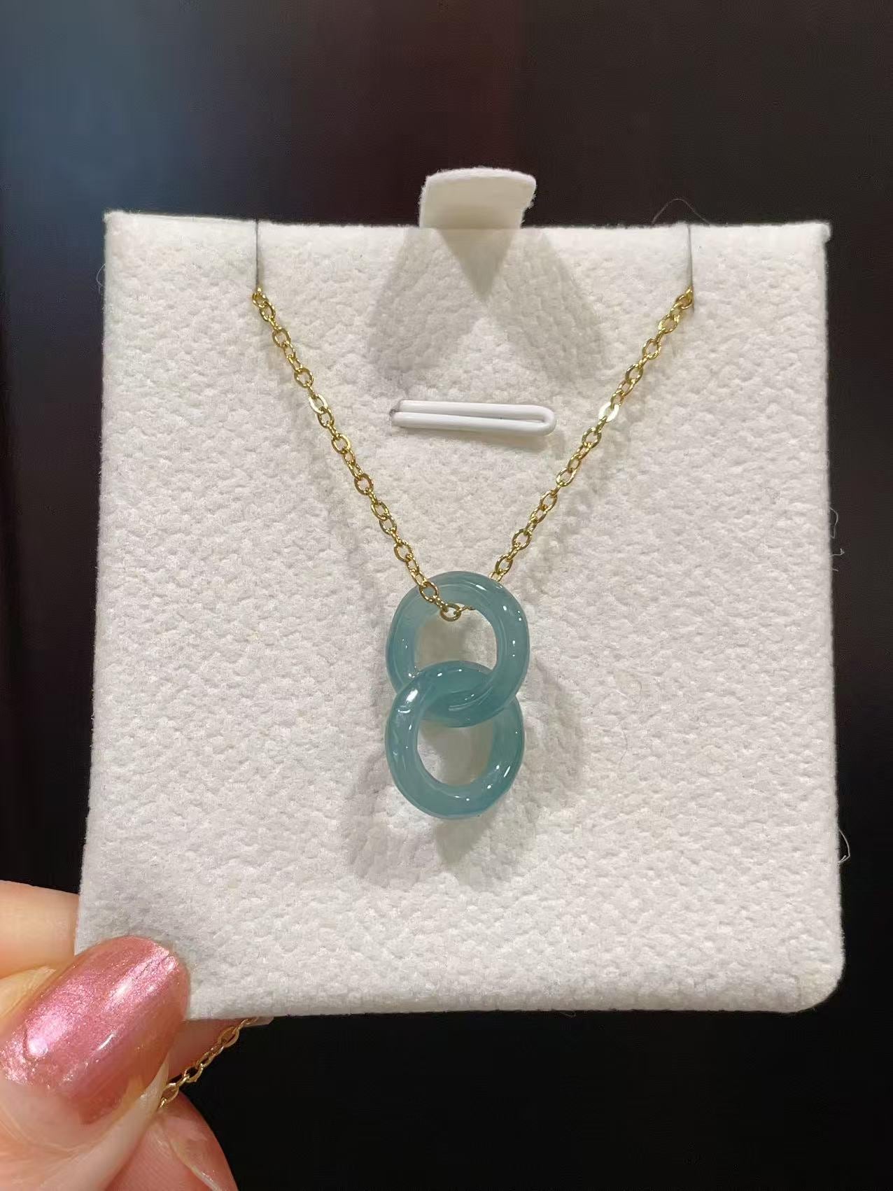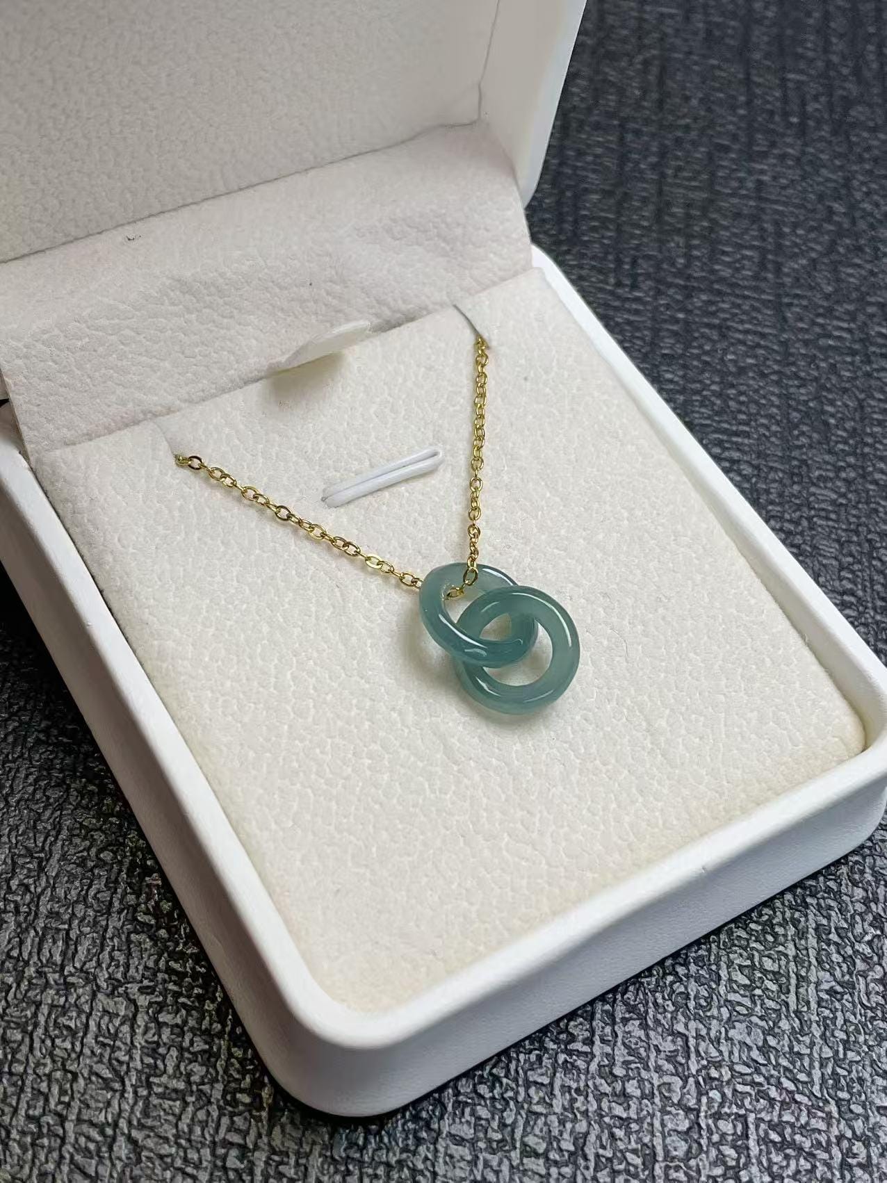 Discover timeless elegance with this Natural Blue Water Jadeite Necklace, featuring two beautifully carved interlocking rings symbolizing eternal connection and harmony. The jadeite displays a serene blue-green translucence, reminiscent of flowing water—calm, pure, and full of life.
