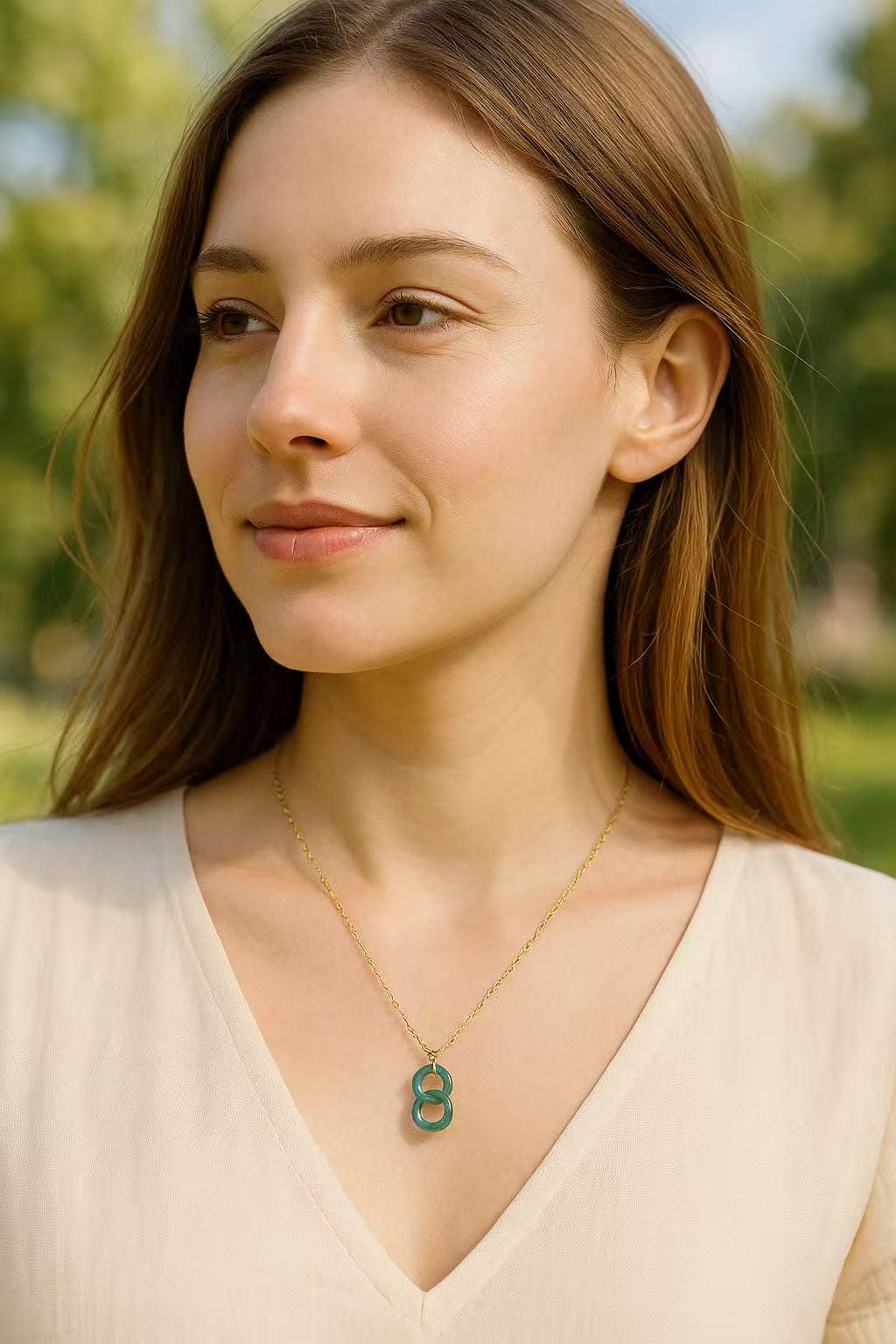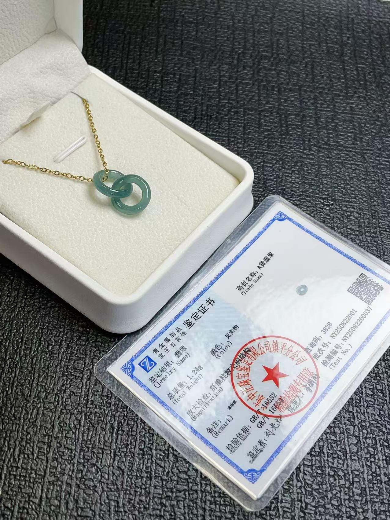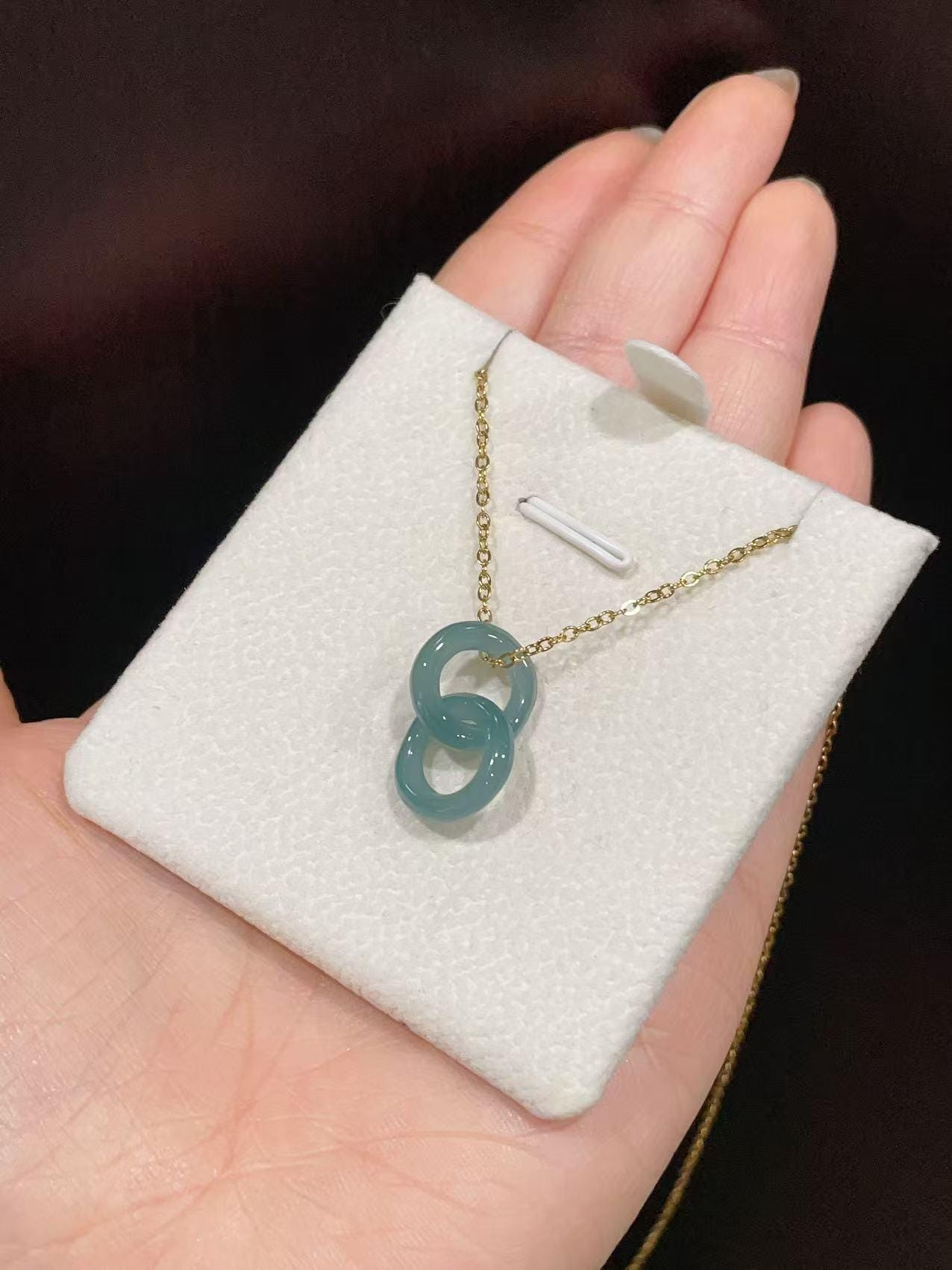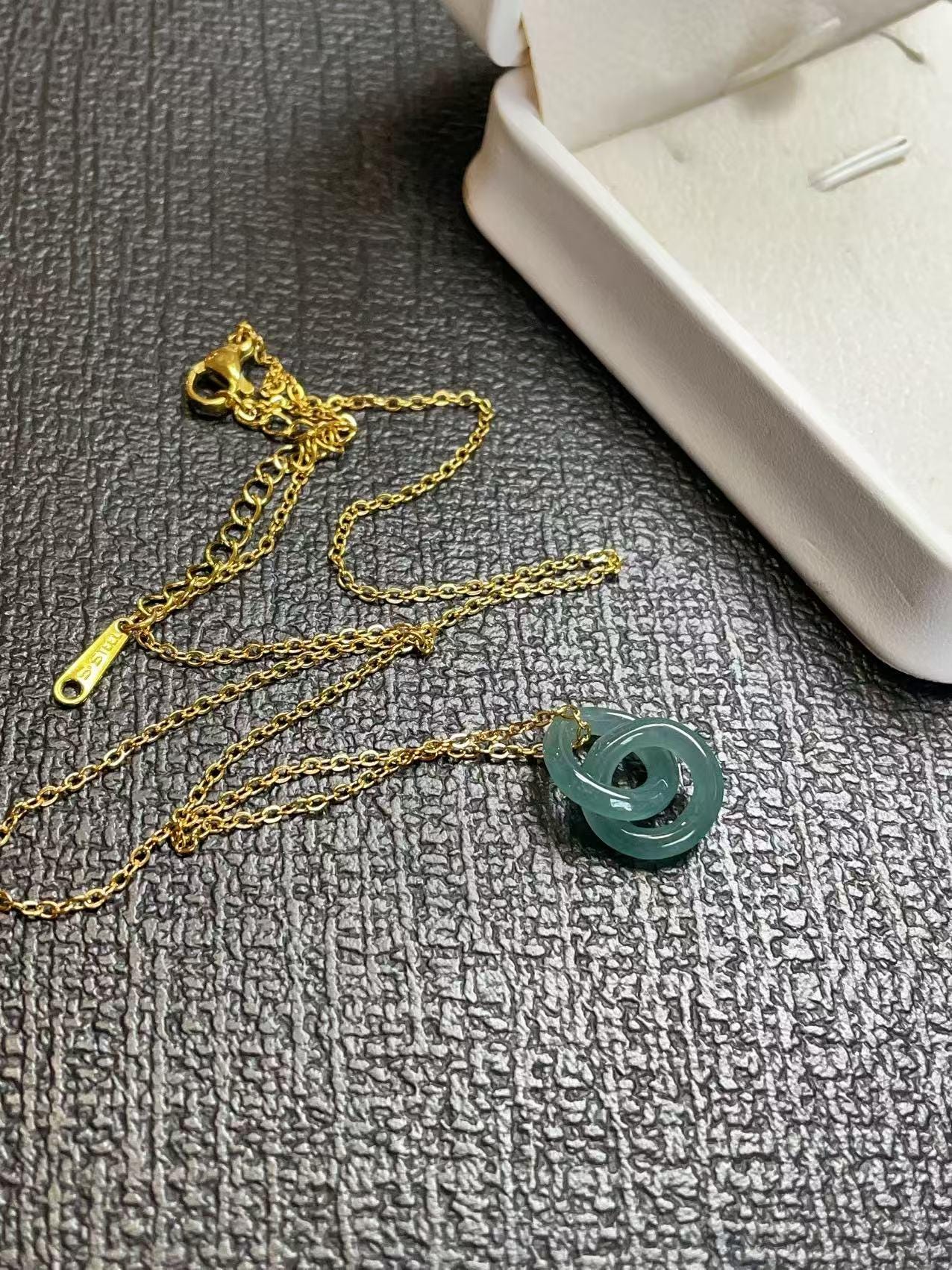 Discover timeless elegance with this Natural Blue Water Jadeite Necklace, featuring two beautifully carved interlocking rings symbolizing eternal connection and harmony. The jadeite displays a serene blue-green translucence, reminiscent of flowing water—calm, pure, and full of life.