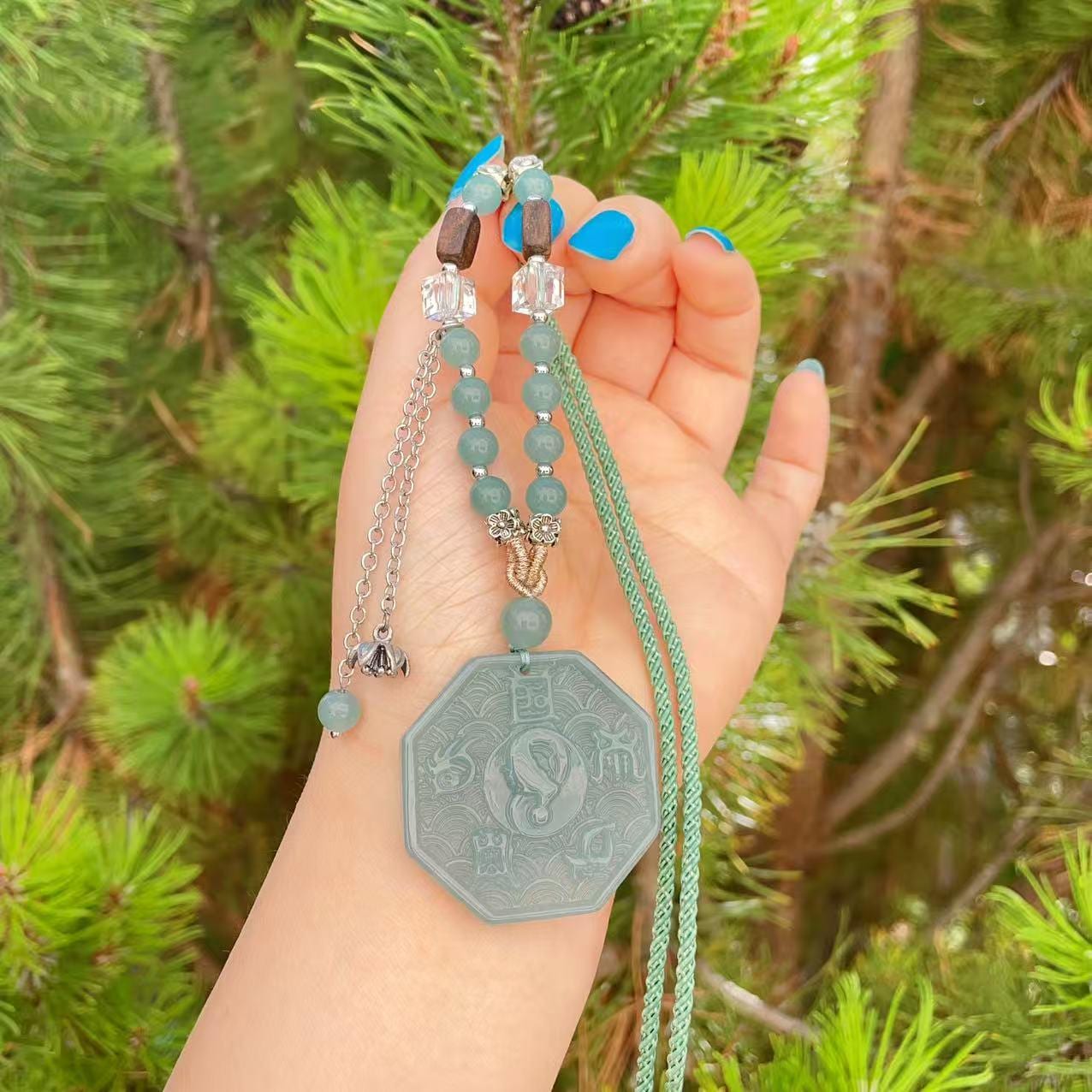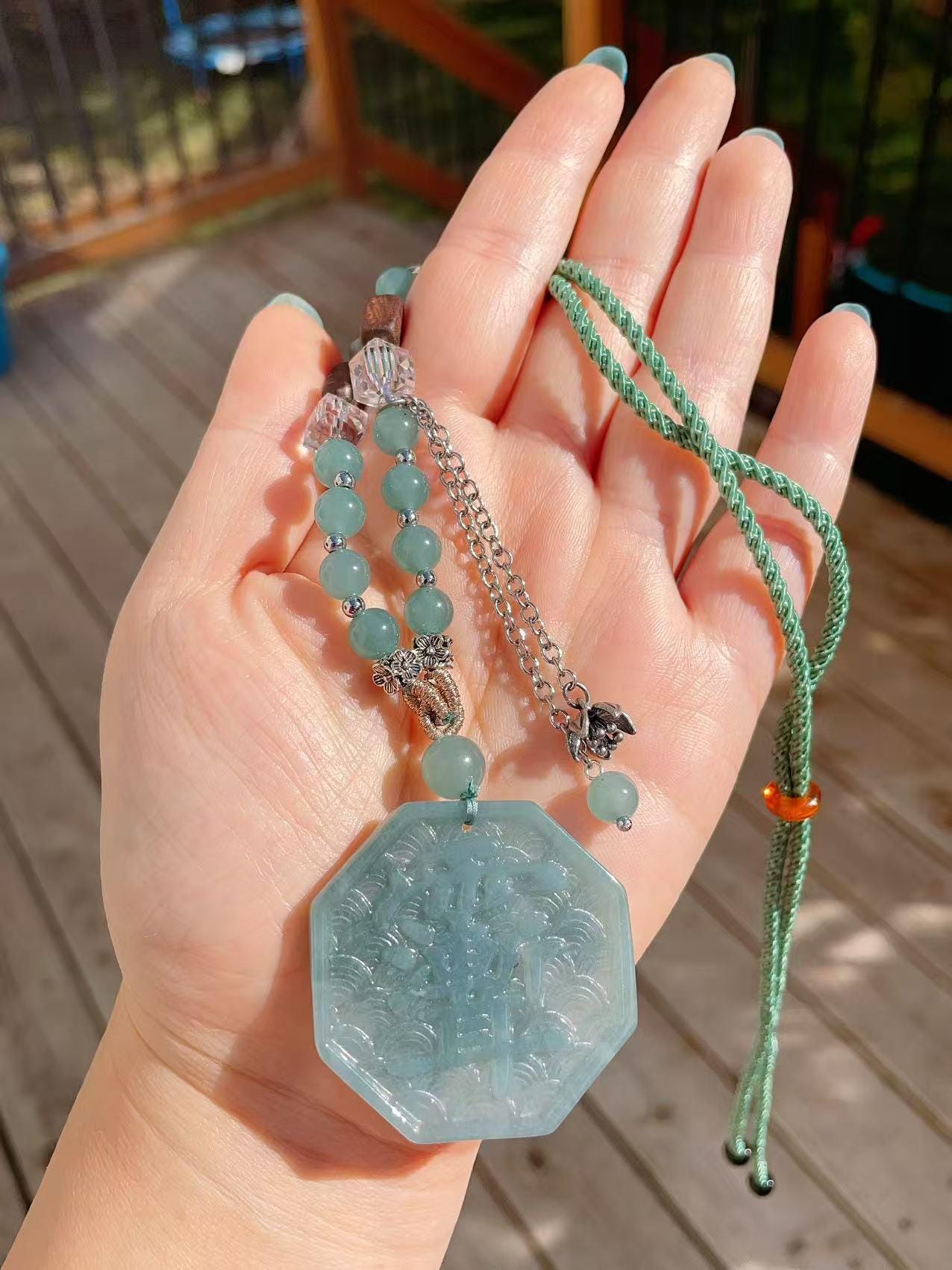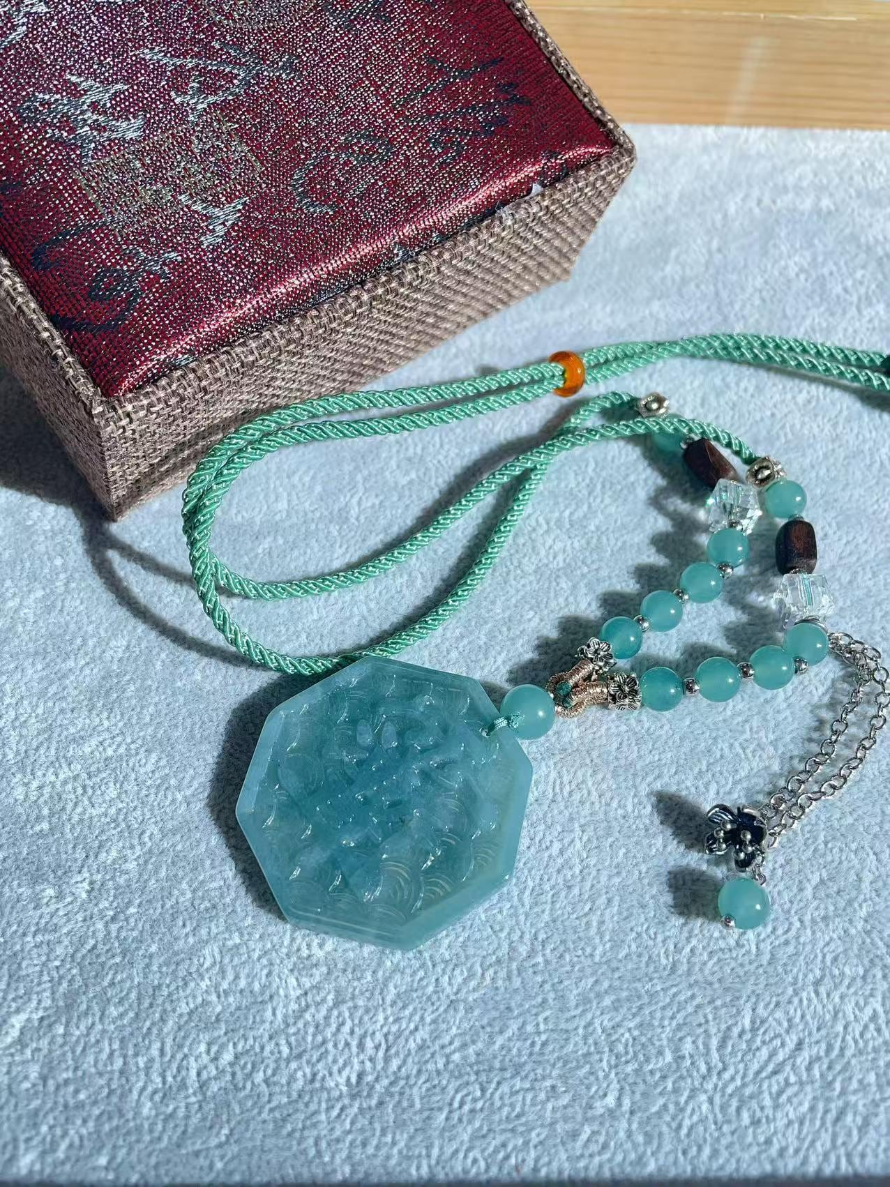 This exquisite necklace features a genuine blue water jadeite pendant, intricately carved in the Lucky Bagua design for balance, harmony, and protection.