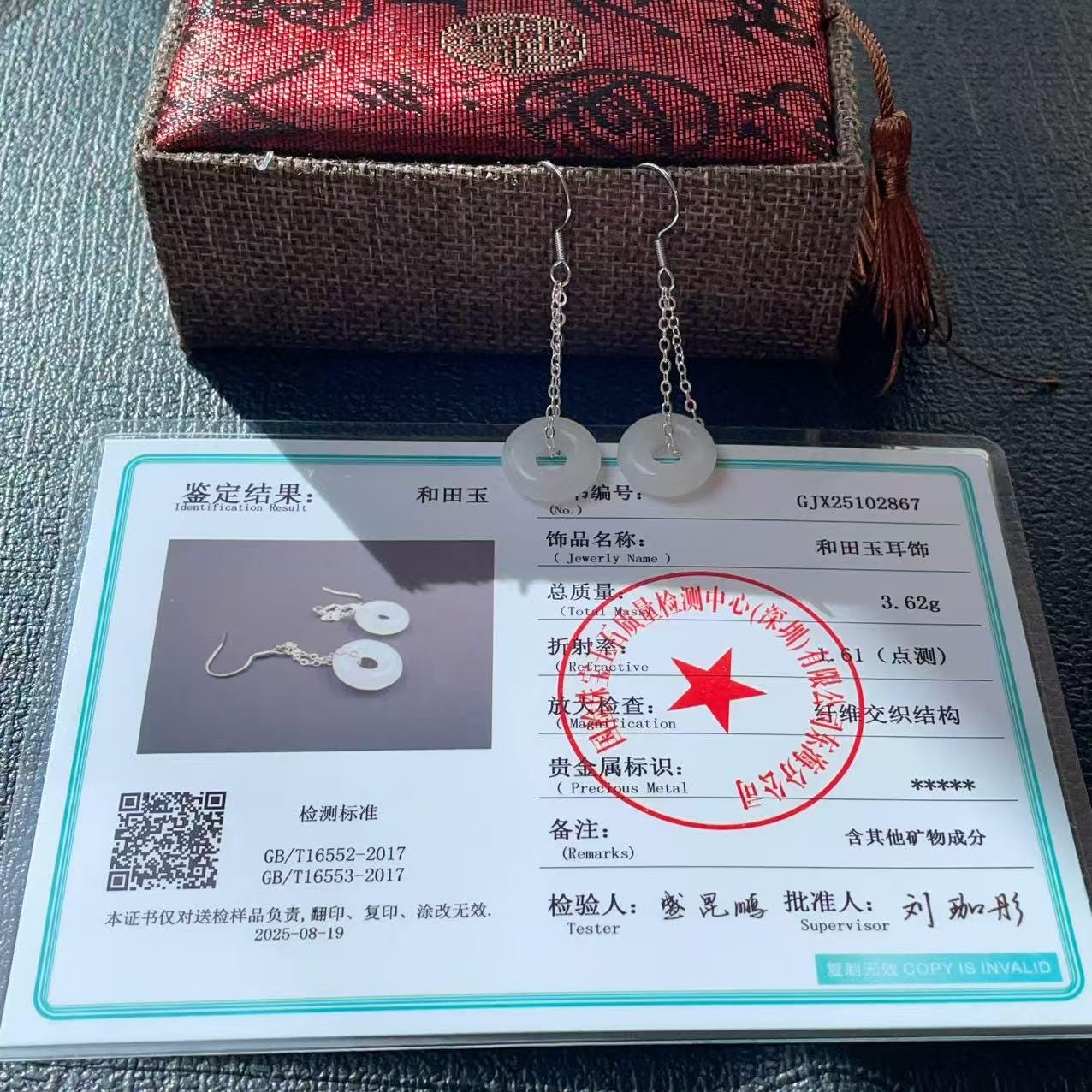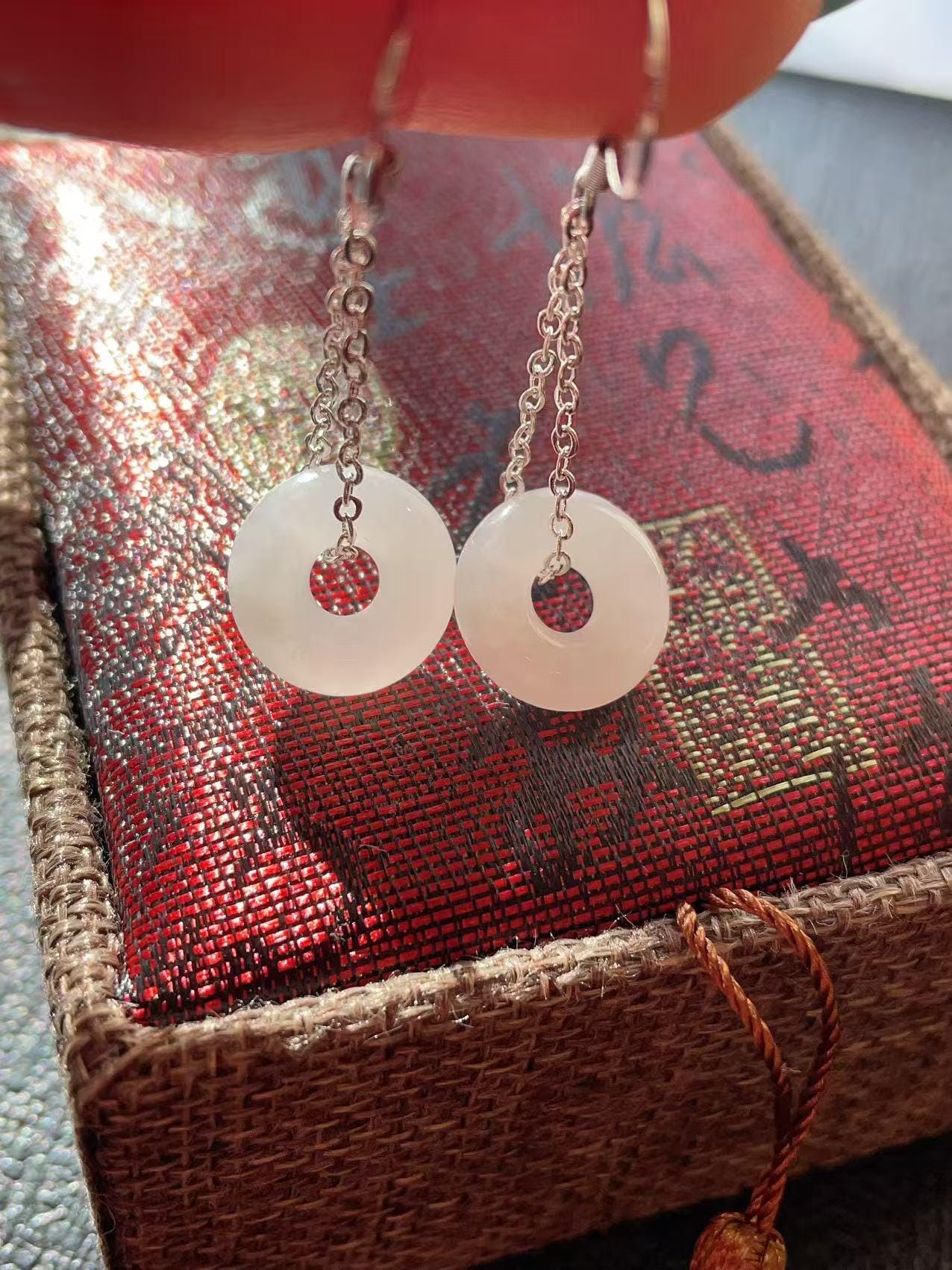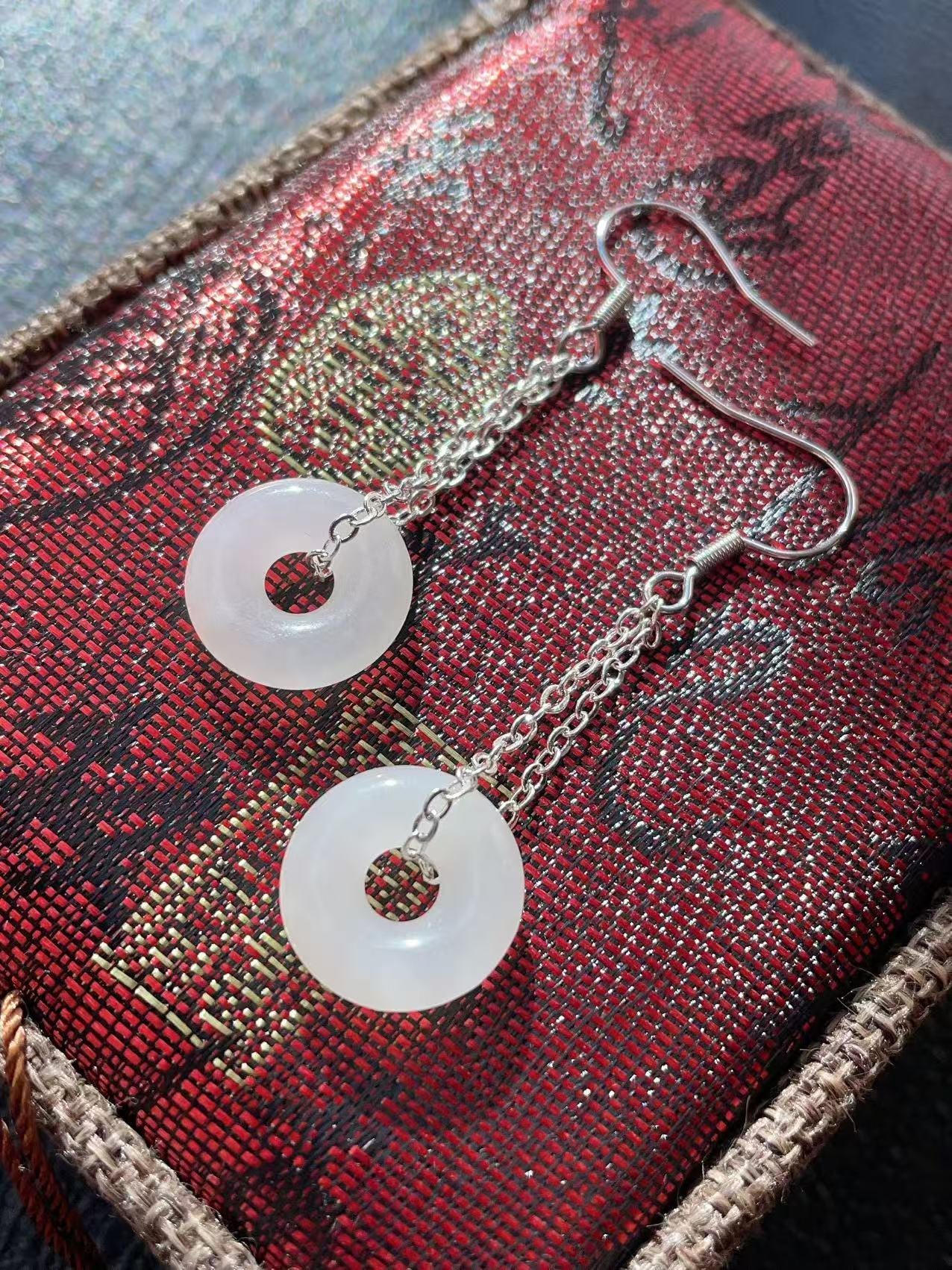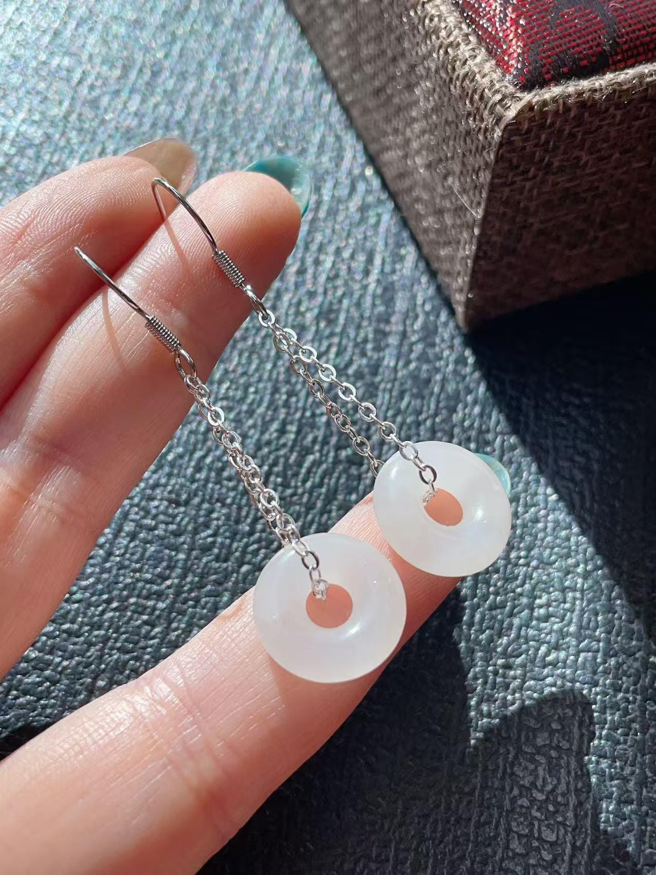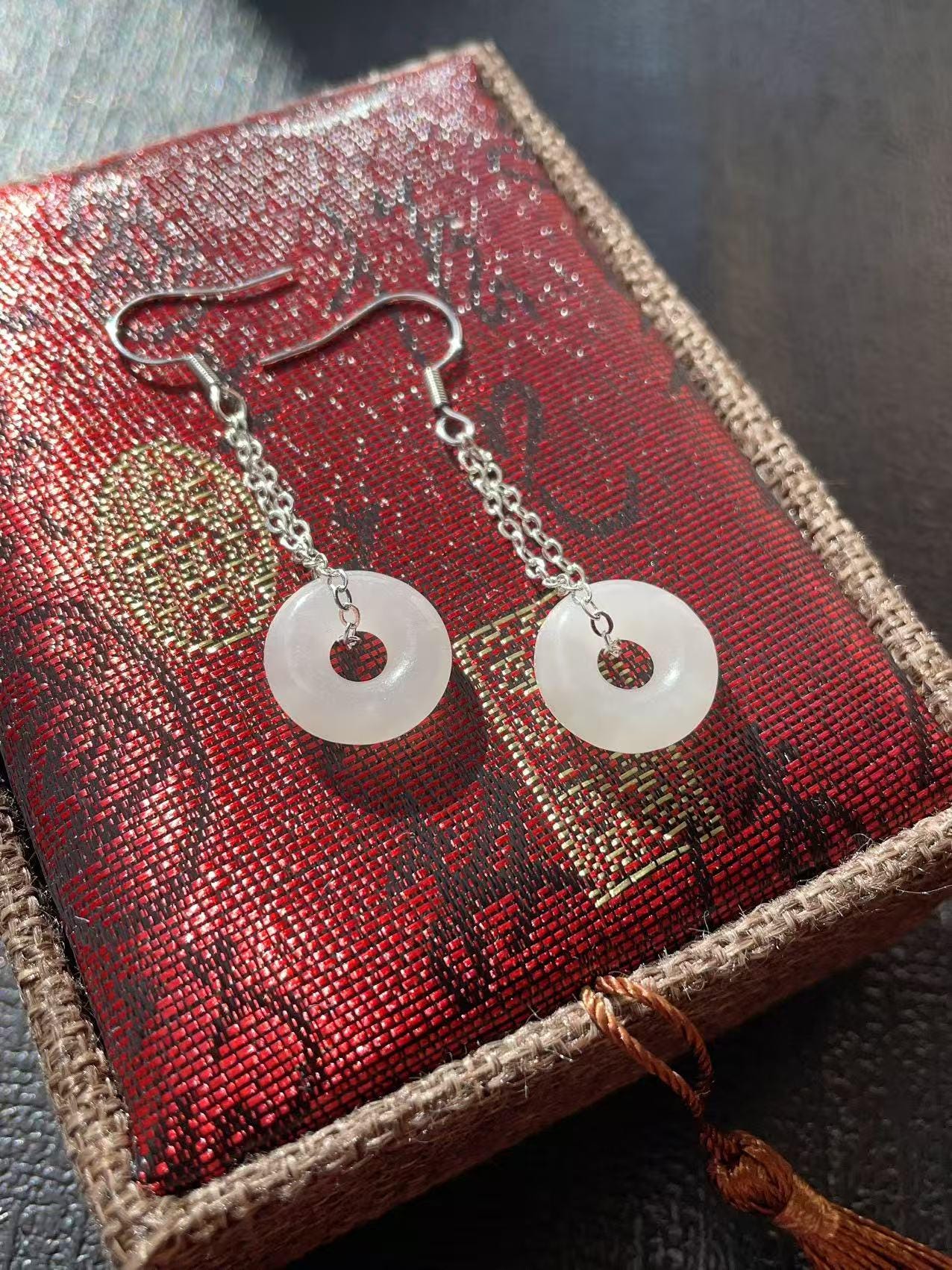 ✨ Elegant and pure — these earrings feature natural white jade in a traditional peace buckle (donut) shape, symbolizing harmony and protection.