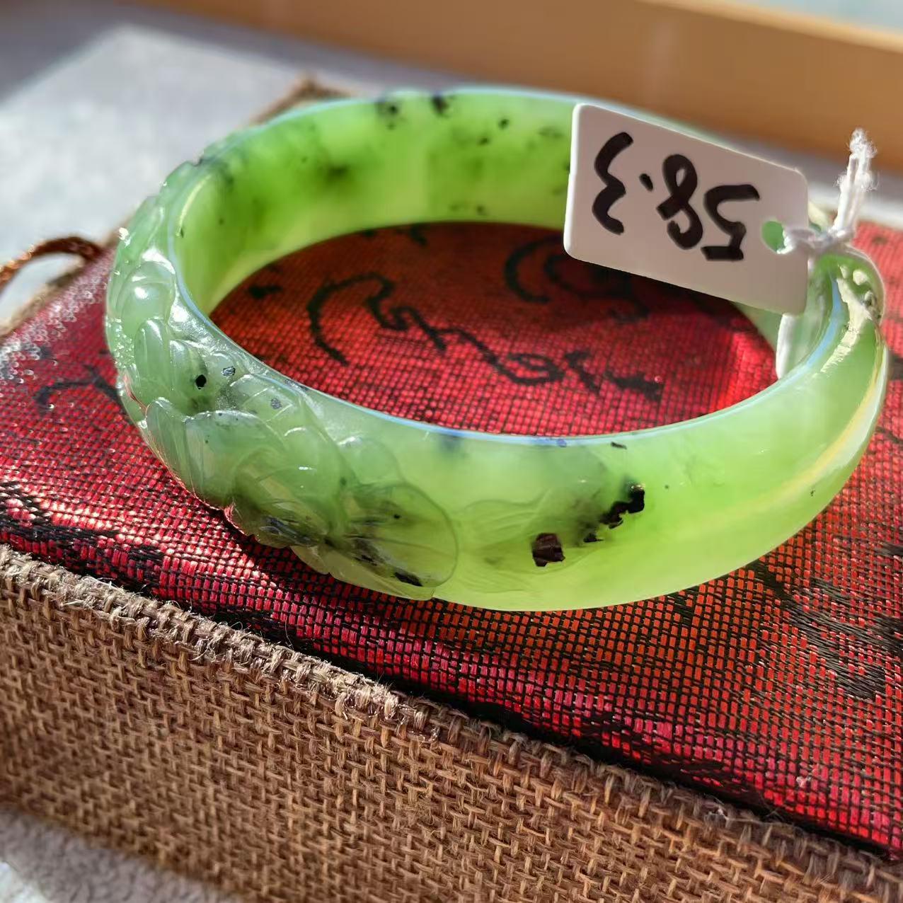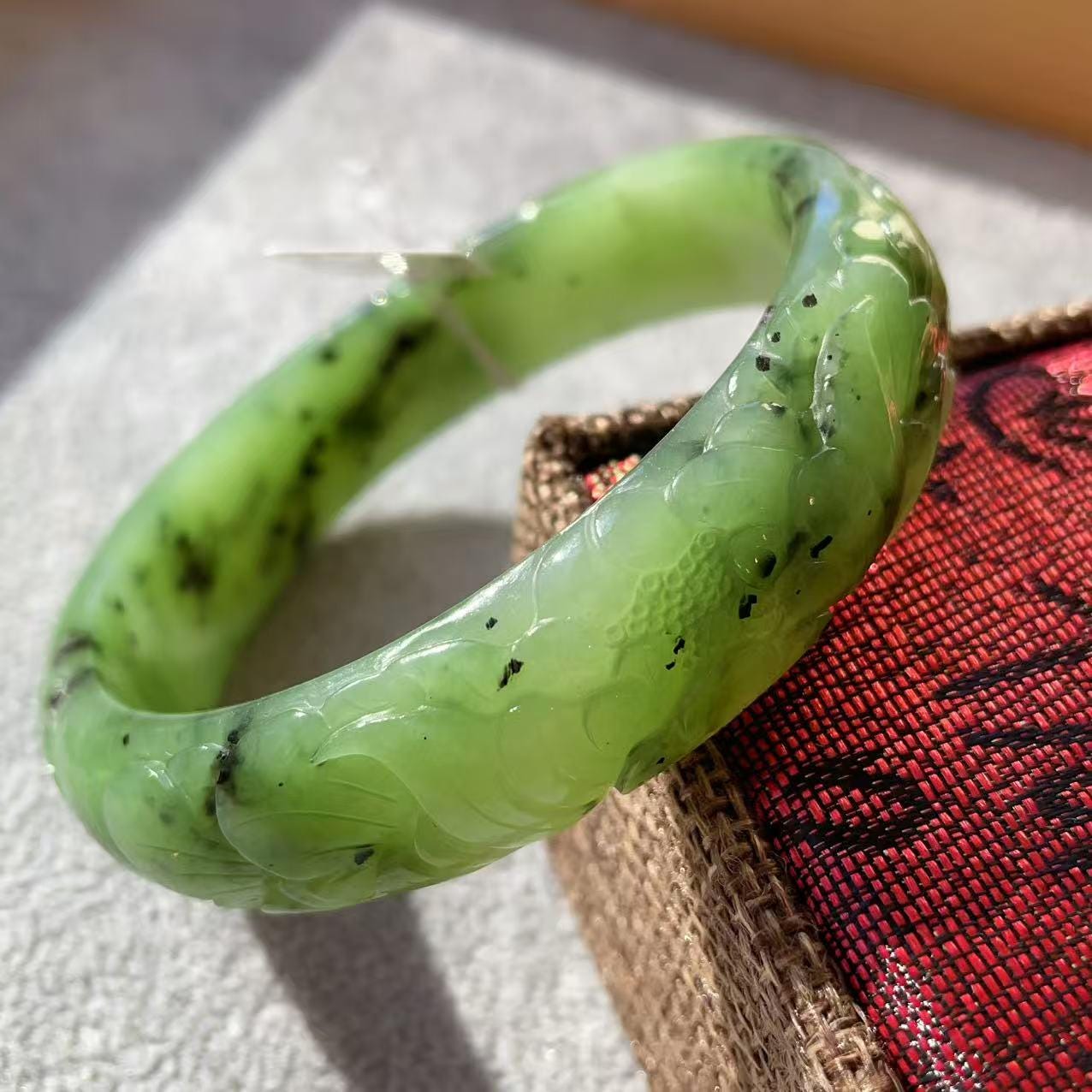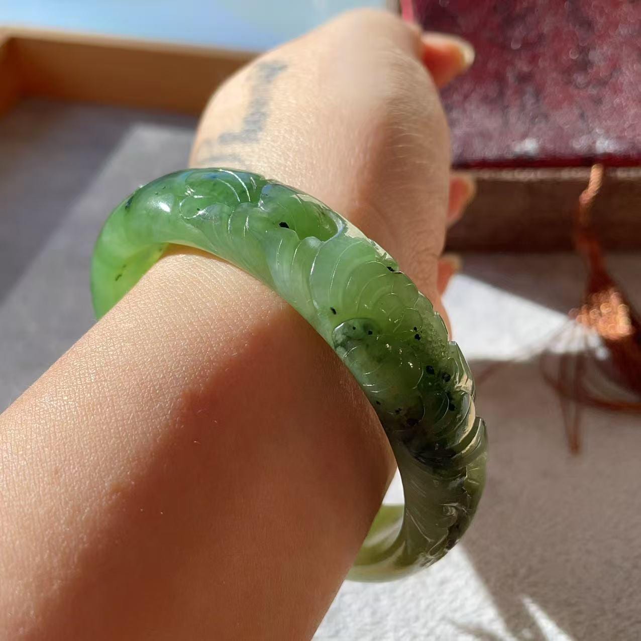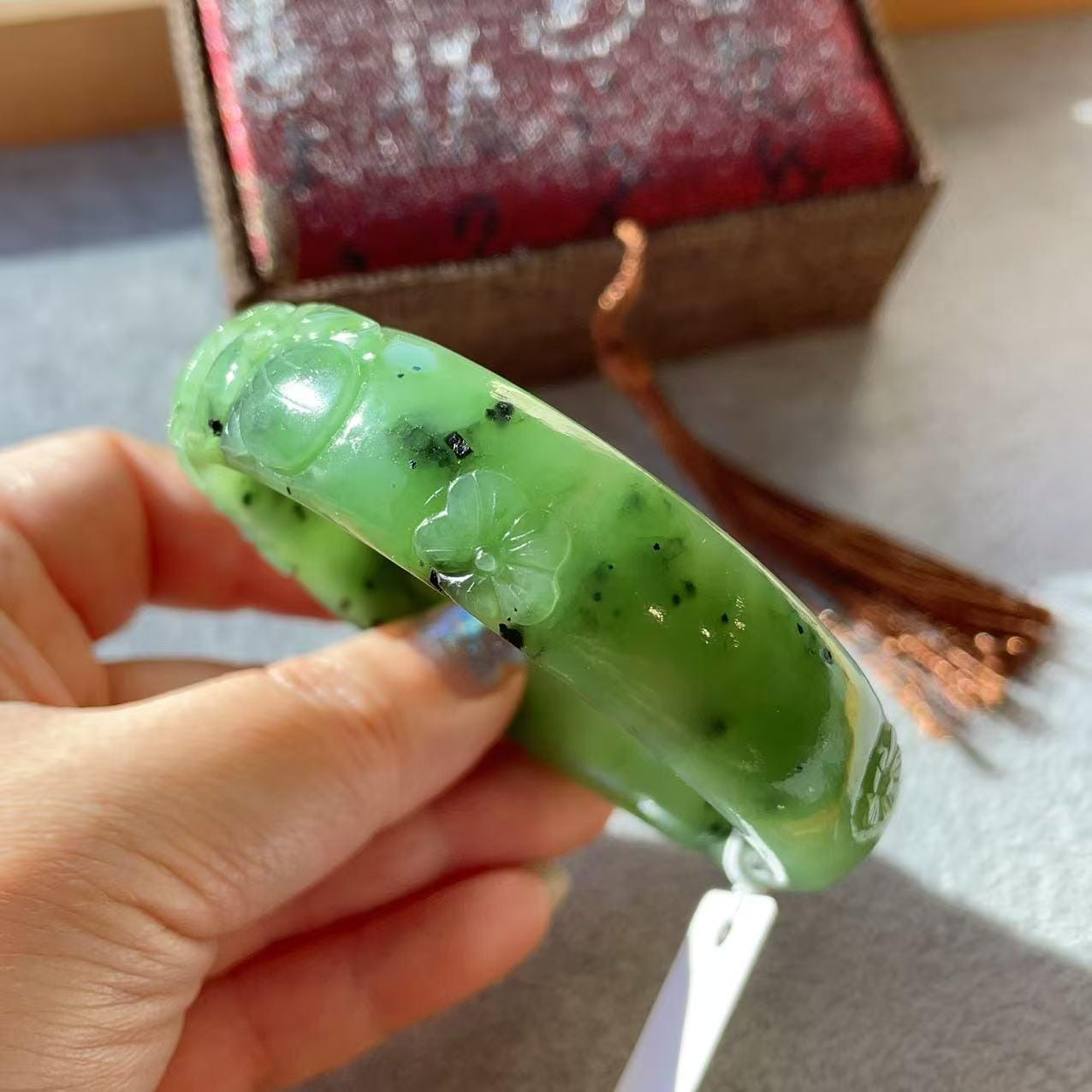 Certified Hand-Carved Kiwi Green Jade Bangle: Floral Nephrite, 58.3mm Thick Bangle Bracelet, Natural Nephrite Jade Bangle