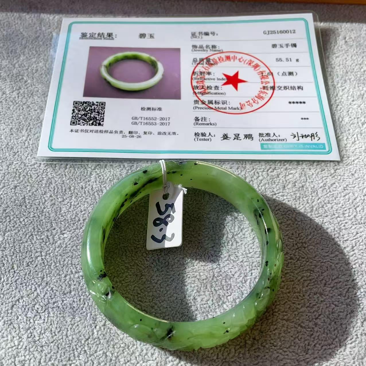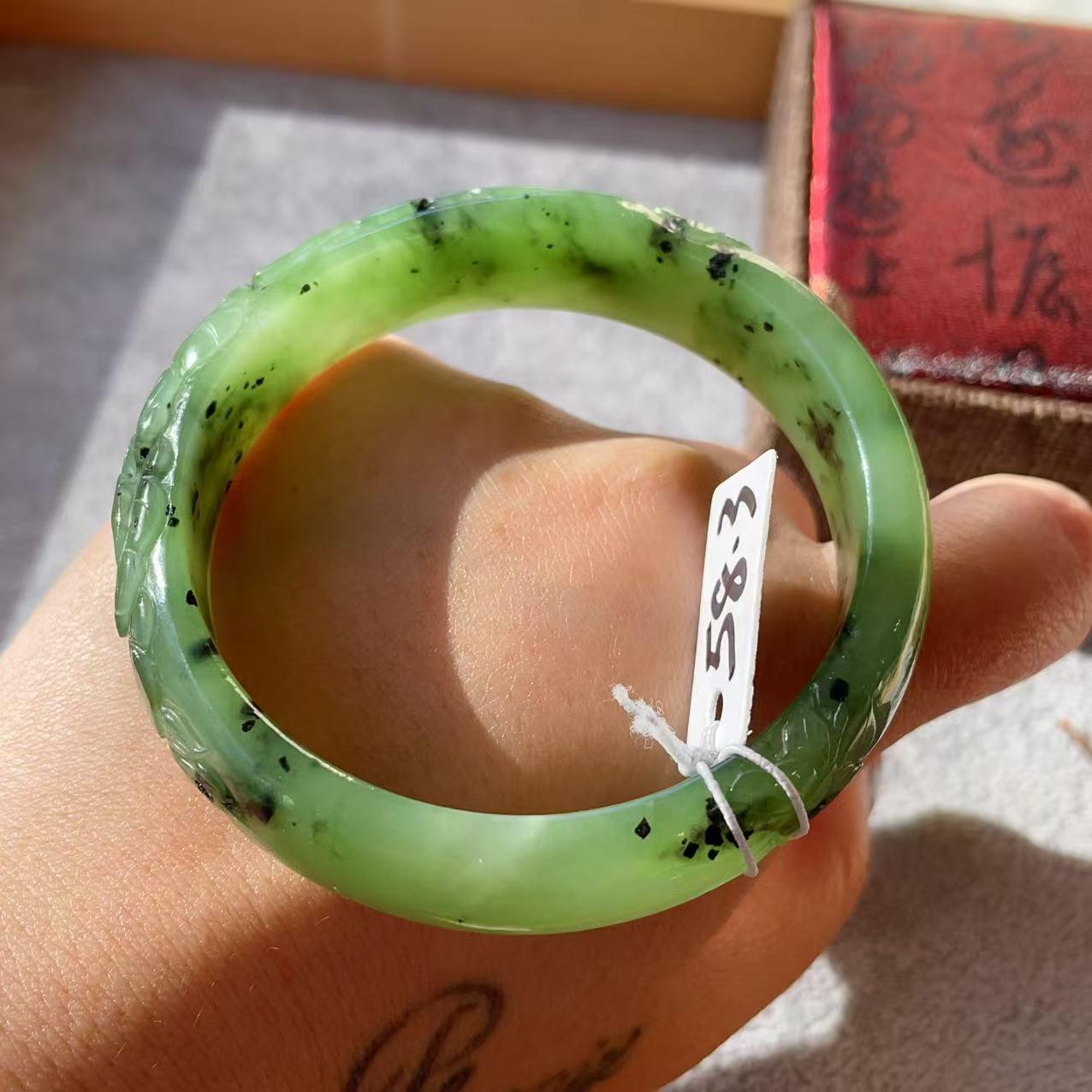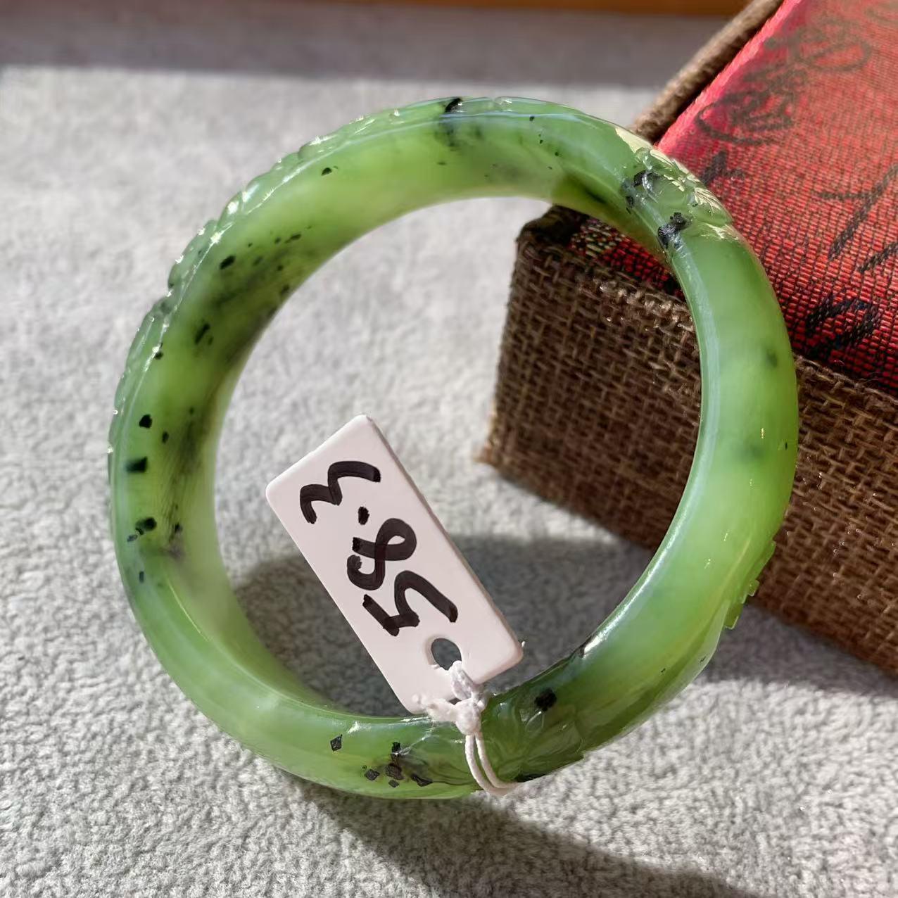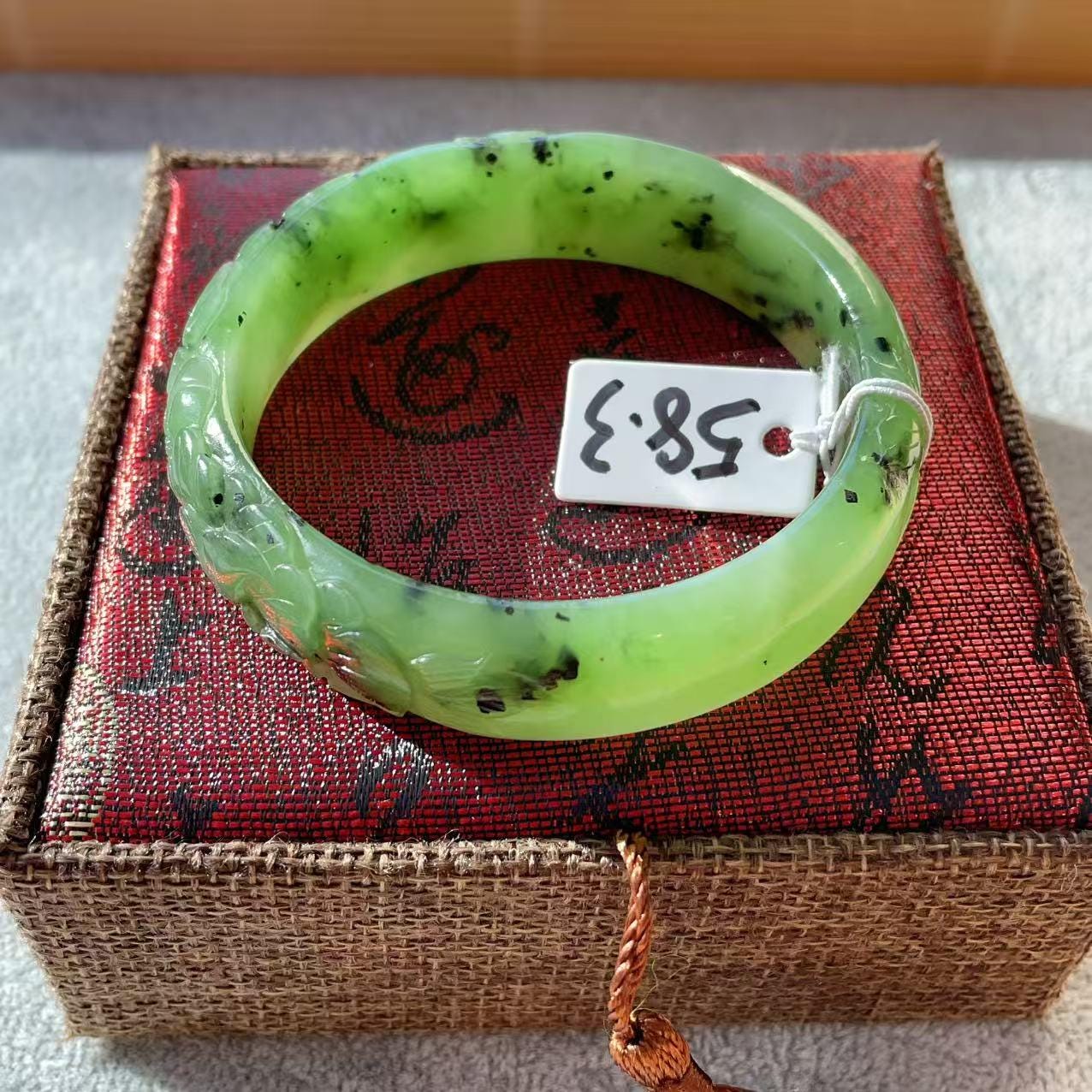 Certified Hand-Carved Kiwi Green Jade Bangle: Floral Nephrite, 58.3mm Thick Bangle Bracelet, Natural Nephrite Jade Bangle